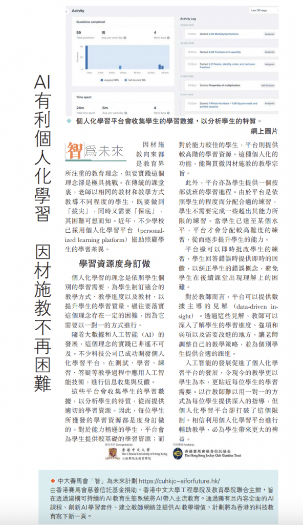 文匯報-教育【智為未來】AI 有利個人化學習 因材施教不再困難