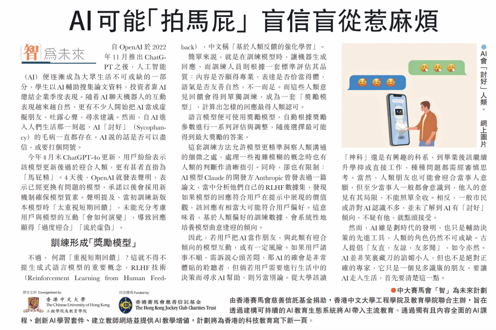 文匯報-教育【智為未來】AI 可能「拍馬屁」 盲信盲從惹麻煩