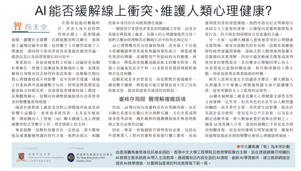 文匯報-教育【智為未來】AI 能否緩解線上衝突、維護人類心理健康?